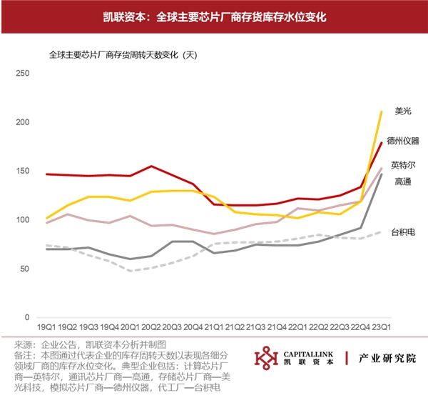 下游PC、云計算、服務(wù)器等市場需求尚未觸底,英特爾正經(jīng)歷庫存調(diào)整階段,23 Q1存貨環(huán)比下降1.75%,存貨周轉(zhuǎn)天數(shù)上升34天,預(yù)計調(diào)整階段將延續(xù)至第三季度。