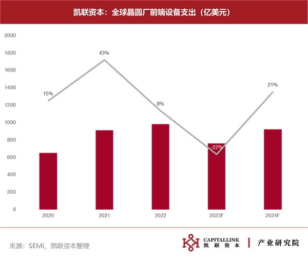 設(shè)備端:源于下游市場芯片需求減弱以及消費和移動設(shè)備庫存增加,預(yù)計2023年全球晶圓廠設(shè)備支出將同比下降22%,從2022年的980億美元的歷史新高降至760億美元,2024年將同比增長21%,恢復(fù)到920億美元。待2023年半導(dǎo)體庫存調(diào)整結(jié)束,伴隨著高性能計算和汽車領(lǐng)域?qū)Π雽?dǎo)體需求持續(xù)催化,預(yù)計2024年晶圓廠設(shè)備支出將逐步復(fù)蘇。