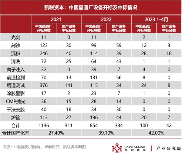 聚焦于國內(nèi)晶圓廠設(shè)備采購情況,2023年1-4月國內(nèi)11家主流晶圓廠累計共開標(biāo)100臺工藝設(shè)備,國產(chǎn)設(shè)備中標(biāo)42臺,其中沉積設(shè)備、后道測試設(shè)備、爐管設(shè)備為主要貢獻增量。據(jù)采購需求及中標(biāo)數(shù)據(jù)測算,近三年國產(chǎn)半導(dǎo)體設(shè)備中標(biāo)率逐步提升,2022年已上漲至39.1%。其中國產(chǎn)半導(dǎo)體設(shè)備在刻蝕、清洗、拋光、干法去膠等領(lǐng)域競爭優(yōu)勢顯著提升,光刻、離子注入等領(lǐng)域設(shè)備仍存較大替代空間。
