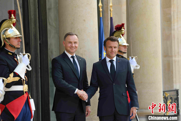 當(dāng)?shù)貢r(shí)間6月12日晚,法國(guó)總統(tǒng)馬克龍?jiān)诎屠钀?ài)麗舍宮會(huì)見(jiàn)波蘭總統(tǒng)杜達(dá)。杜達(dá)前來(lái)出席當(dāng)天舉行的法德波三國(guó)領(lǐng)導(dǎo)人會(huì)談。 中新社記者 李洋 攝