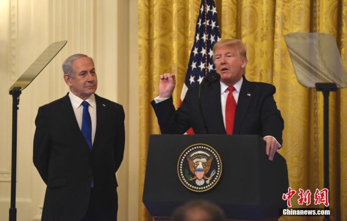 資料圖:當(dāng)?shù)貢r間2020年1月28日,時任美國總統(tǒng)特朗普和以色列總理內(nèi)塔尼亞胡在白宮舉行聯(lián)合發(fā)布會,宣布所謂推動解決巴勒斯坦與以色列問題的“世紀(jì)協(xié)議”。巴勒斯坦方面此前已表示,該協(xié)議違反國際法,呼吁國際社會予以拒絕。 中新社記者 陳孟統(tǒng) 攝