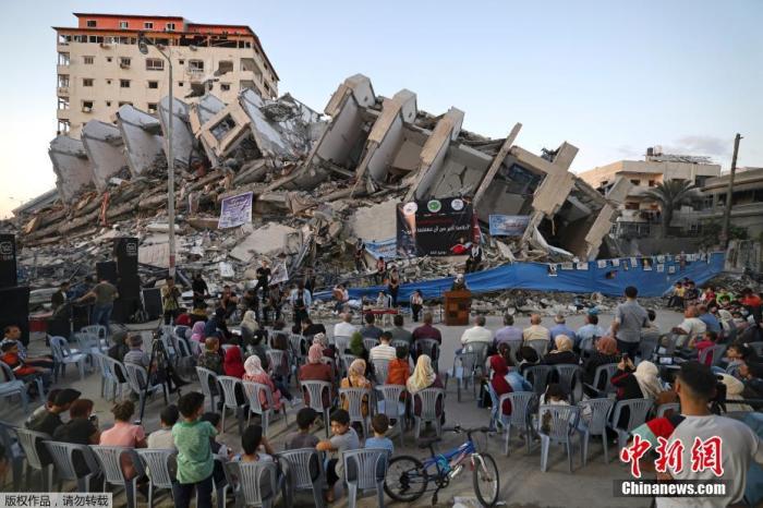 資料圖:當(dāng)?shù)貢r間2021年6月2日,加沙地帶,巴勒斯坦音樂家在遭受以色列空襲的房屋廢墟上演奏音樂。