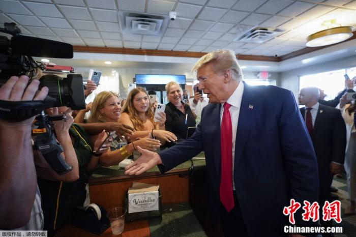 法庭聽證會結(jié)束后,特朗普在邁阿密一家著名餐廳停留。他被數(shù)十名支持者包圍,與他們握手并合影留念。