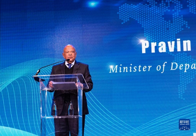 6月13日,在南非約翰內(nèi)斯堡,南非國(guó)有企業(yè)部長(zhǎng)普拉溫·戈?duì)柕ぴ谥袊?guó)-南非新能源投資合作大會(huì)上致辭。新華社記者 張譽(yù)東 攝