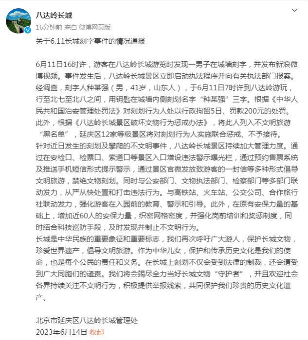 經調查,刻字人種某強(男,41歲,山東人),于6月11日7時許到八達嶺游玩,行至北七至北八之間,用鑰匙在城墻內側刻劃名字“種某強”三字。根據(jù)《中華人民共和國治安管理處罰法》對刻劃行為人處以行政拘留5日、罰款200元的處罰。此外,根據(jù)《八達嶺長城景區(qū)破壞文物行為懲戒辦法》,將此人列入不文明旅游“黑名單”,延慶區(qū)12家等級景區(qū)將對刻劃行為人實施聯(lián)合懲戒、不予接待。