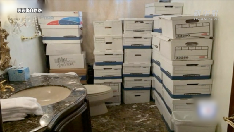一些存放文件的箱子堆在海湖莊園的一個淋浴間內(nèi)。(視頻截圖)