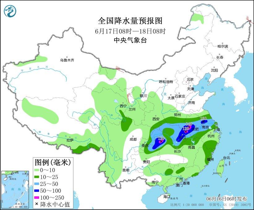 6月17日08時(shí)至18日08時(shí),陜西東南部、重慶中東部、貴州東北部、河南南部、湖北、湖南北部、安徽大部、江西北部、江蘇中南部、上海、浙江南部、福建東北部等地部分地區(qū)有中到大雨,其中,河南東南部、安徽中部、江蘇中部、湖北東部和西南部、湖南西北部、重慶東南部、貴州東北部等地部分地區(qū)有暴雨或大暴雨(100~140毫米)。甘肅河西部分地區(qū)有4~6級風(fēng)(見圖3)。