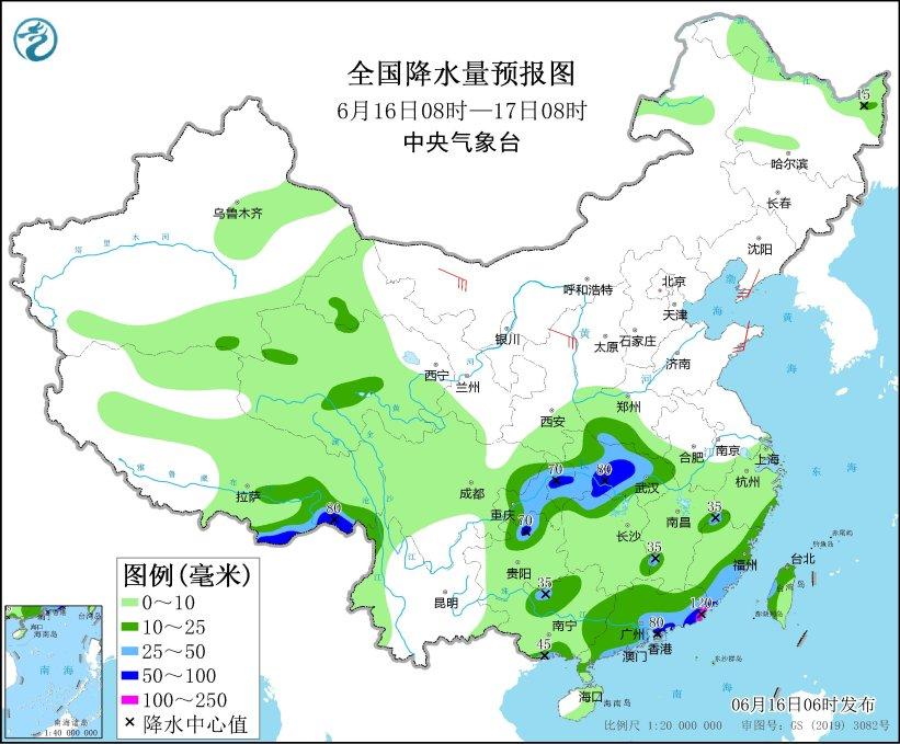 6月16日08時(shí)至17日08時(shí),西藏東南部、四川東北部、重慶大部、河南南部、湖北大部、湖南北部、貴州東北部、廣西北部和東南部、廣東大部、福建東部和西北部、臺灣島西部等地部分地區(qū)有中到大雨,其中,西藏東南部、貴州東北部、重慶東北部、湖北中部和西南部、廣東東南部沿海等地局地有暴雨或大暴雨(100~120毫米)。遼寧半島、山東半島等地部分地區(qū)有5~6級風(fēng)(見圖2)。