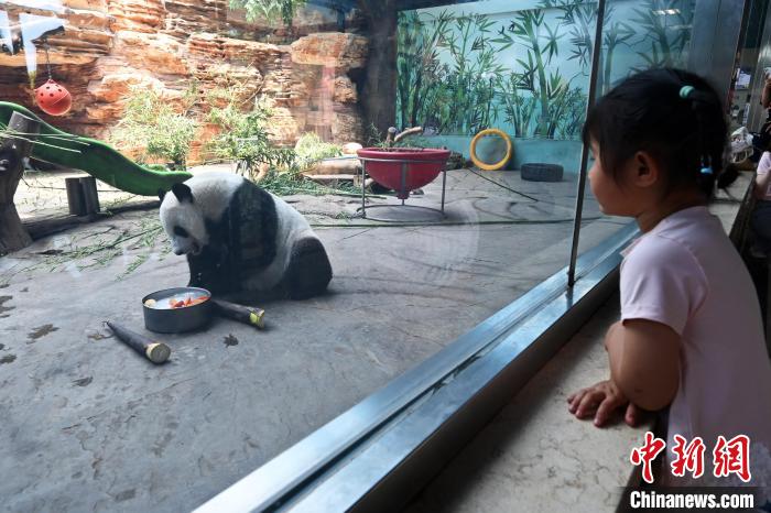 6月15日,石家莊市動物園,大熊貓坐在放有冰塊的房間里,吹著空調(diào)享用美食。中新社記者 翟羽佳 攝