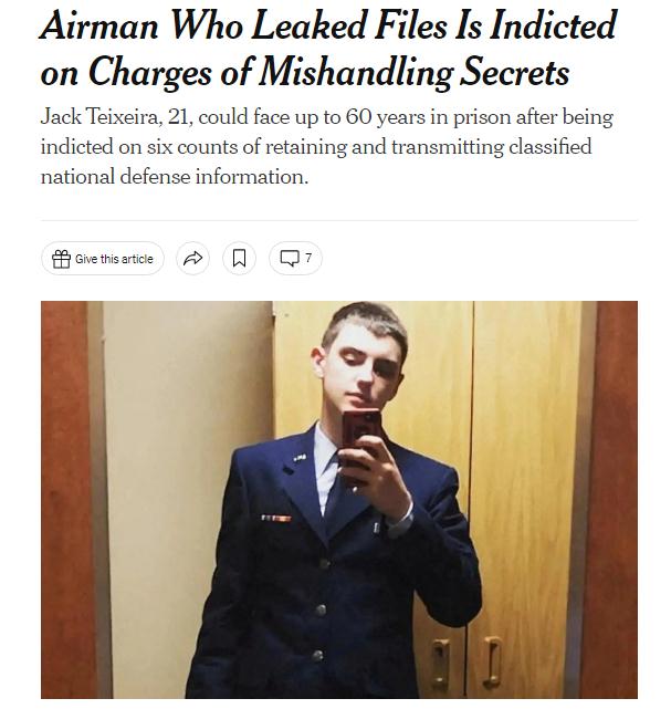 中新網(wǎng)6月16日電 綜合外媒報道,當(dāng)?shù)貢r間15日,美國聯(lián)邦大陪審團(tuán)起訴21歲的空軍國民警衛(wèi)隊成員杰克?特謝拉(Jack Teixeira),罪名是保留和傳播國防機(jī)密信息等。