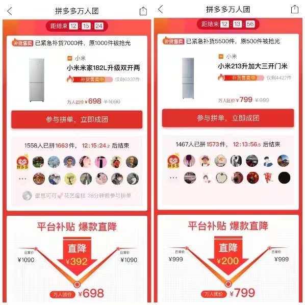 ▲在萬人團中,小米米家213升三門冰箱、182L升級雙開兩門冰箱兩大單品緊急補貨超萬件。
