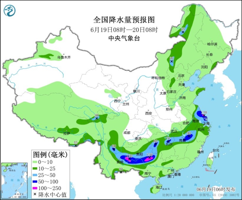 6月19日08時(shí)至20日08時(shí),江蘇中東部、上海、浙江北部和西南部、安徽南部、江西北部、湖南西部和北部、貴州中南部和東部、廣西北部、云南東部、四川南部以及內(nèi)蒙古東部、青海南部等地部分地區(qū)有大到暴雨,其中,江蘇東南部、貴州西南部、云南東部、廣西北部等地部分地區(qū)有大暴雨(100~140毫米)。