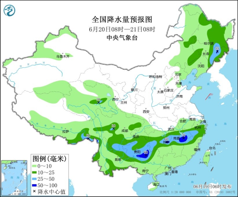 6月20日08時(shí)至21日08時(shí),黑龍江南部、吉林東部、青海東部、西藏東南部、四川西部和南部、云南西北部和東北部、貴州西部和中南部、廣西北部、湖南西南部和東部、江西北部、福建西北部、浙江西南部等地部分地區(qū)有大雨,其中,吉林東部、湖南中部、江西中北部、貴州東南部、廣西北部等地局地有暴雨(50~80毫米)。
