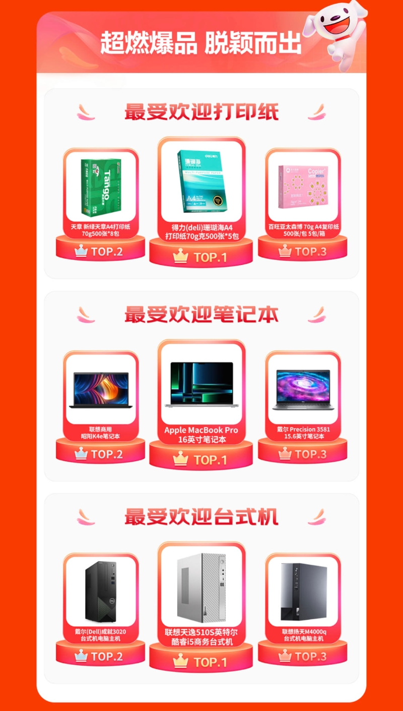 數(shù)字技術(shù)的發(fā)展與進(jìn)步,使得當(dāng)下辦公模式向數(shù)字化的智慧辦公模式轉(zhuǎn)變,中小企業(yè)對高效智能辦公產(chǎn)品的采購需求不斷增加,打印紙、筆記本、臺式機等產(chǎn)品在京東618備受企業(yè)采購的歡迎。作為銷冠復(fù)印紙的得力(deli)珊瑚海A4打印紙最受企業(yè)客戶喜愛;具有極強性能、有效提高企業(yè)員工辦公效率的Apple MacBook Pro 16英寸筆記本電腦成為最受企業(yè)客戶歡迎的筆記本產(chǎn)品;聯(lián)想商用昭陽K4e筆記本電腦以及戴爾 Precision 3581 15.6英寸筆記本電腦受歡迎度緊隨其后;此外,聯(lián)想天逸510S英特爾酷睿i5商務(wù)臺式機成最受企業(yè)客戶歡迎的臺式機產(chǎn)品;戴爾(Dell)成就3020臺式機電腦主機與聯(lián)想揚天M4000q臺式機電腦主機則分別位列TOP2、TOP3,深受企業(yè)客戶喜愛。