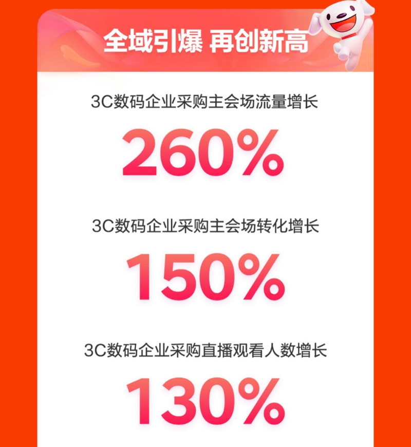 京東企業(yè)業(yè)務(wù)在B端市場渠道、客戶需求理解方面有著多年的沉淀和積累,也一直以“拓展上游資源、延長辦公服務(wù)鏈條、豐富場景集成解決方案”為抓手,不斷完善對于企業(yè)商用場景的服務(wù)能力,深受企業(yè)客戶的認(rèn)可,在今年618期間也實現(xiàn)了流量的大爆發(fā)。數(shù)據(jù)顯示,3C數(shù)碼企業(yè)采購主會場流量增長260%;3C數(shù)碼企業(yè)采購主會場轉(zhuǎn)化增長150%;3C數(shù)碼企業(yè)采購直播觀看人數(shù)也取得了增長130%的好成績。