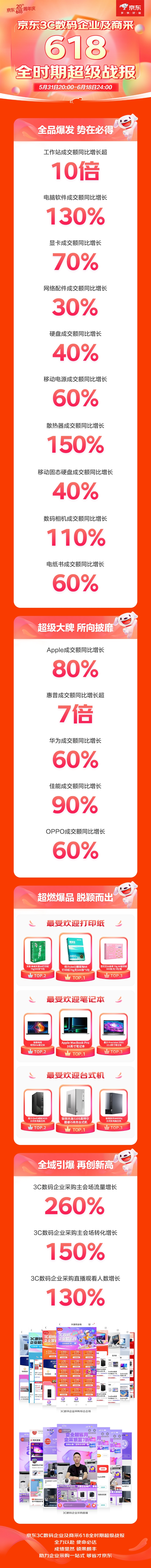 隨著6月18日24點的到來,今年京東618完美收官。恰逢京東創(chuàng)業(yè)二十周年,今年京東618以更豐富的產(chǎn)品、更省的價格以及更貼心的服務(wù),在調(diào)動普通消費者購物熱情的同時,也為企業(yè)客戶打造了一場采購盛宴。今年618,京東3C數(shù)碼企業(yè)及商采也交出了一份亮眼的答卷,各品類銷售紀(jì)錄不斷刷新,筆記本、臺式機等產(chǎn)品也備受企業(yè)客戶青睞,3C數(shù)碼超800個品牌企業(yè)客戶成交額同比增長超100%,迎來了全面增長!