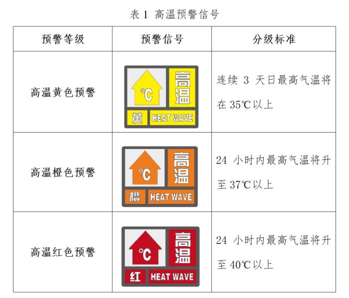 (1)高溫預(yù)警信號?!稓庀鬄?zāi)害預(yù)警信號及防御指南》規(guī)定高溫預(yù)警信號分三級(詳見表1)。