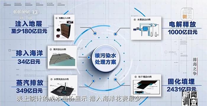 經(jīng)過兩年半的研討,日本技術(shù)委員會總結(jié)出了五種處理方案。方案一,注入地層,將污染水注入2500米深左右的地層結(jié)構(gòu)中。方案二,排入海洋,將核污染水稀釋或分離放射性物質(zhì)后排入大海。方案三,蒸汽排放,將核污染水進行蒸發(fā),通過排氣管道排入大氣。方案四,電解釋放,將核污染水進行電解反應(yīng)將生成的氫氣排入大氣。方案五,固化填埋,把核污染水和水泥等材料混合成固態(tài)后埋入地底。表上統(tǒng)計的成本造價顯示,排入海洋花費最少。