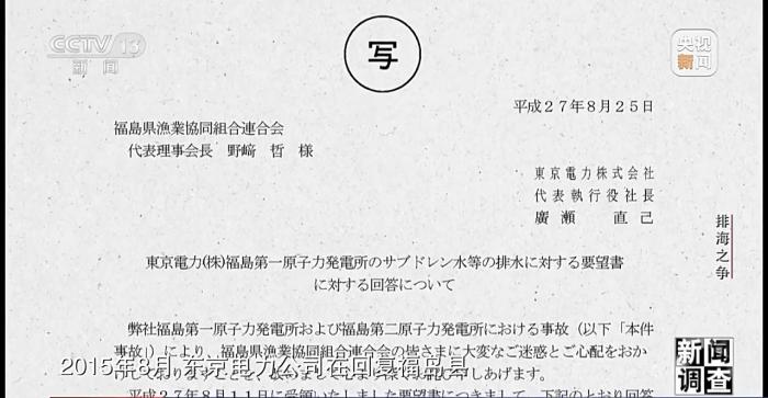 2015年8月,東京電力公司在回復(fù)福島縣漁業(yè)協(xié)作組合聯(lián)合會的請愿書時做出書面承諾,在得到包括漁業(yè)從業(yè)者在內(nèi)的相關(guān)人員理解之前,不會對核污染水進行任何處理。