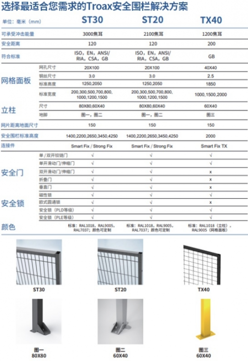 在安全方面,TX40鋼制安全圍欄系統(tǒng)可承受1200焦耳的沖擊能量,適用于場地空間比較大的生產(chǎn)區(qū)域。對于可接受此抗沖擊標(biāo)準(zhǔn),并且有足夠安全防護(hù)空間的客戶來說,TX40將是一款高性價(jià)比的安全圍欄系統(tǒng),選擇TX40可以節(jié)約成本,讓客戶達(dá)到經(jīng)濟(jì)效益最大化。在滿足工廠需要的同時(shí),保障安全、提高生產(chǎn)效率。如需了解更多產(chǎn)品細(xì)節(jié),請閱讀以下表格了解TX40產(chǎn)品以及其它也同樣適合您的TROAX(圖瓦斯)安全圍欄解決方案。