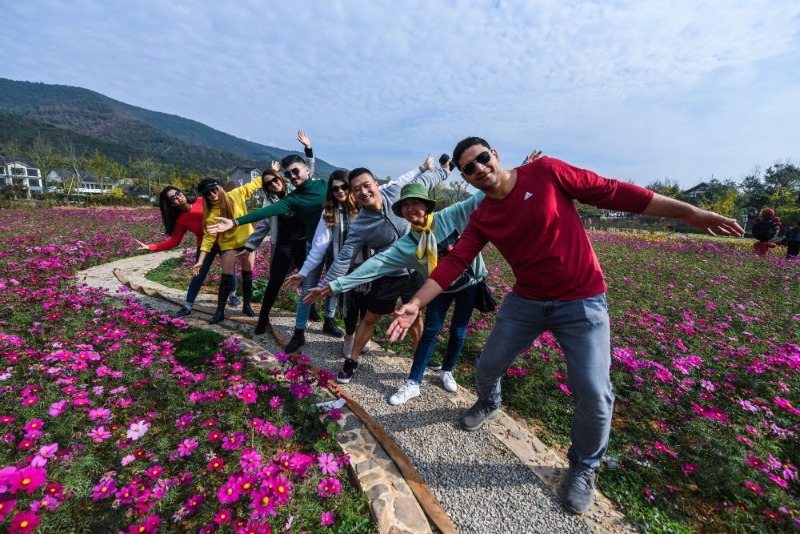 2019年11月6日,外國游客在湖州市長興縣小浦鎮(zhèn)的千畝花海中合影。(徐昱 攝)