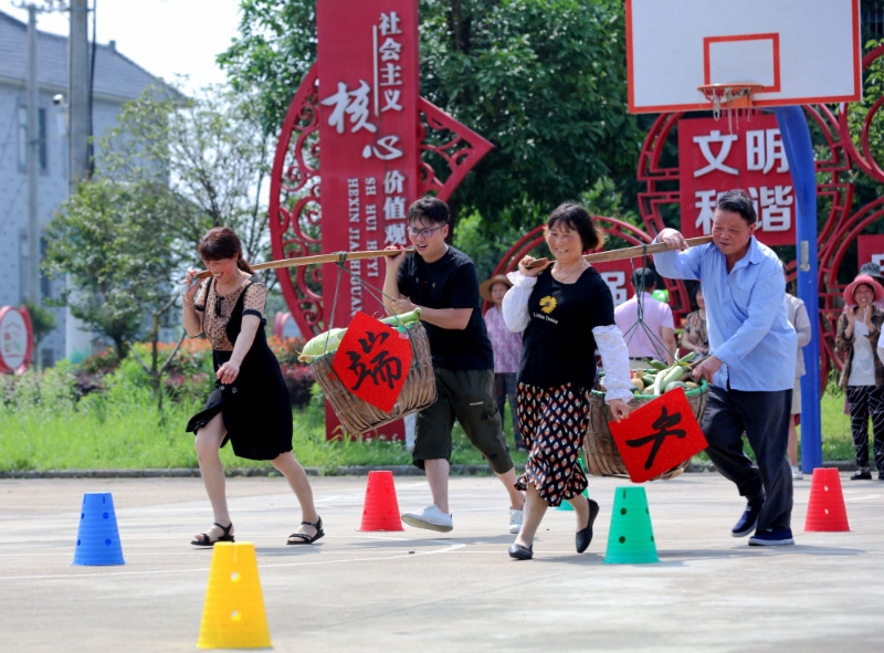 2023年6月21日,在湖州市長興縣和平鎮(zhèn)長崗村文化禮堂前廣場,當(dāng)?shù)卮迕裾谶M(jìn)行挑擔(dān)子繞障礙物比賽。(徐昱 攝)