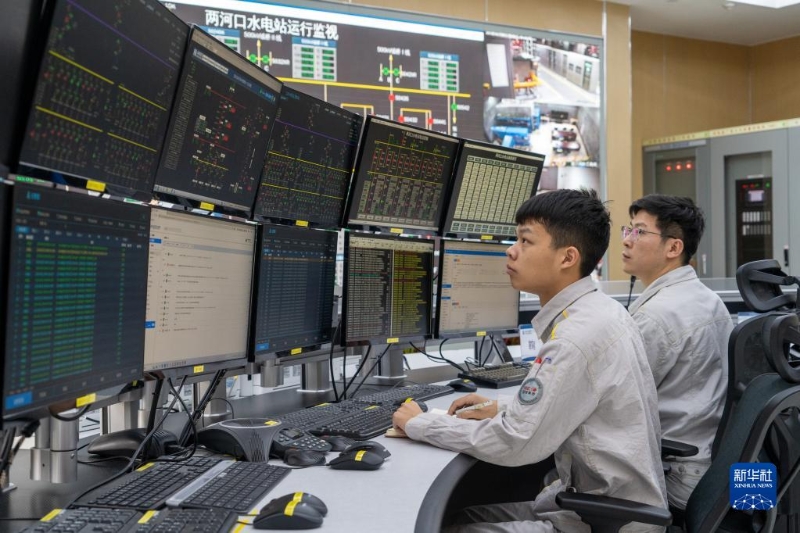 在兩河口水電站中控室內,工作人員在對水電與光伏發(fā)電進行調度和監(jiān)視控制(6月22日攝)。