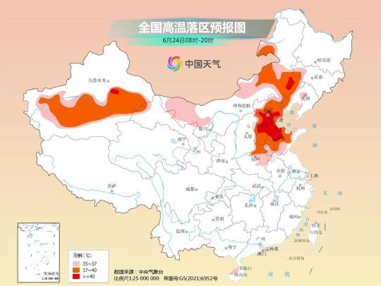 24日,華北、黃淮等地將持續(xù)出現(xiàn)35℃以上的高溫天氣,其中,北京、天津、河北、山東中北部、河南北部等地最高氣溫有37~39℃,北京、天津、河北中部、山東北部等地的部分地區(qū)可達40℃左右;此外,新疆吐魯番和南疆盆地、內(nèi)蒙古西部和東部等地也有35℃~38℃的高溫天氣,局地最高氣溫可達40℃左右。