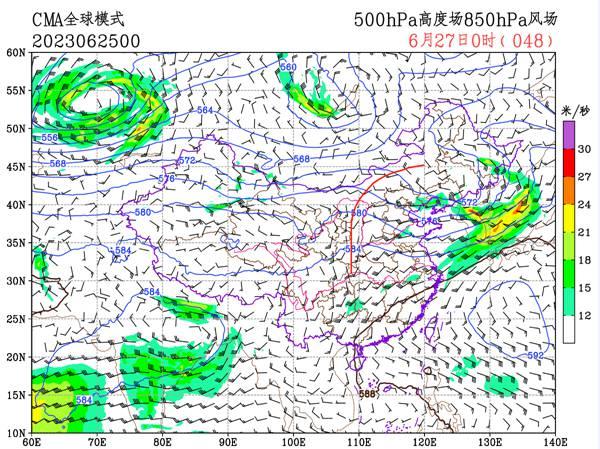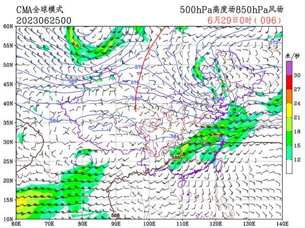 大家可以看看27日和29日的中央氣象臺(tái)模式預(yù)報(bào),分別有兩個(gè)高壓脊(紅線位置)將陸續(xù)東移過(guò)境,前者對(duì)應(yīng)的是27開(kāi)始的新一輪高溫,后面那個(gè)強(qiáng)度更強(qiáng),控制范圍也更大,它正對(duì)應(yīng)了7月之后北方高溫范圍的進(jìn)一步擴(kuò)大、增強(qiáng)。