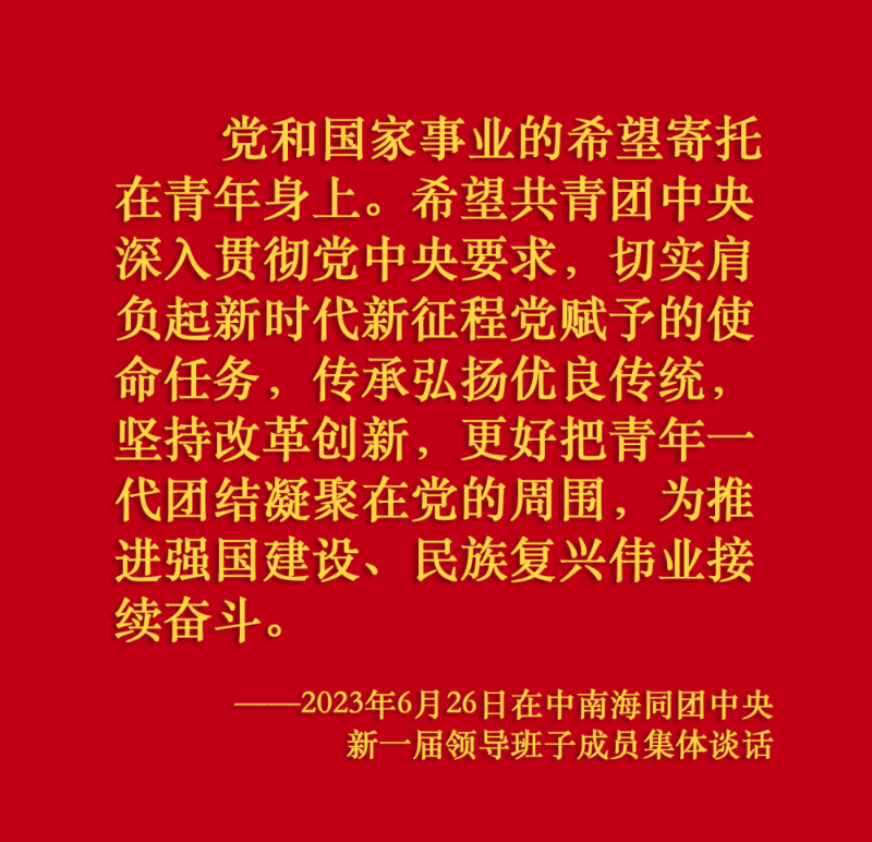 6月26日,中共中央總書記、國家主席、中央軍委主席習(xí)近平在中南海同團中央新一屆領(lǐng)導(dǎo)班子成員集體談話并發(fā)表重要講話。