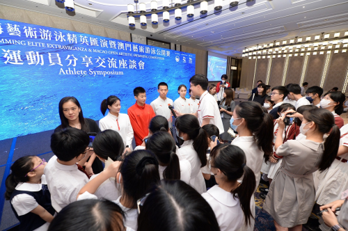 借著國家花泳高手聚首澳門的難得機會,美高梅在賽事結(jié)束后增設(shè)了“分享交流座談會”,邀請來自三支頂尖花泳隊和澳門花泳游泳隊共六位精英運動員:石浩玙、程文濤、張依瑤、楊順誠、戴詩意以及歐陽善盈,親身分享各自的心路歷程和奮斗故事,激勵青年人勇于克服困難,學(xué)習(xí)如何突破自己和挑戰(zhàn)極限;并從美學(xué)和藝術(shù)等多角度出發(fā),深入探討花泳運動。座談會吸引近200名澳門花泳游泳隊隊員、本地運動員、青年和學(xué)校師生參與。