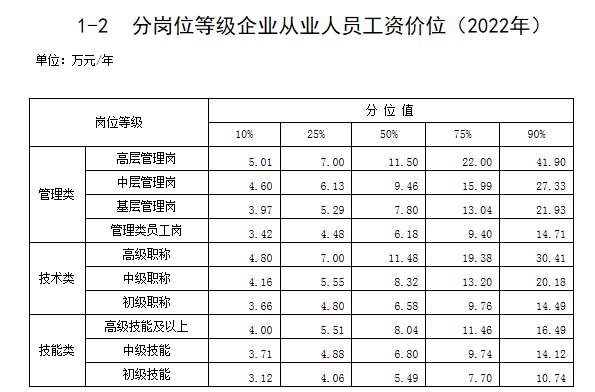 分崗位等級(jí)企業(yè)從業(yè)人員工資價(jià)位顯示,包括管理類崗位等級(jí)、技術(shù)類崗位等級(jí)、技能類崗位等級(jí)三類。