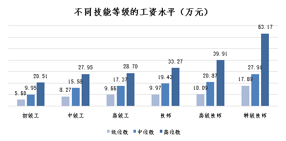 技能類崗位等級(jí)指按國家職業(yè)技能標(biāo)準(zhǔn)或行業(yè)企業(yè)評(píng)價(jià)規(guī)范設(shè)置的職業(yè)技能等級(jí),包括高級(jí)技能及以上、中級(jí)技能、初級(jí)技能。從中位數(shù)來看,高級(jí)技能及以上8.04萬元/年,中級(jí)技能6.8萬元/年,初級(jí)技能5.49萬元/年。