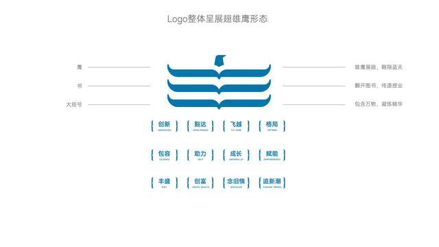 此外,全新LOGO整體呈展翅雄鷹形態(tài),“鷹”的身體由包含萬物、凝練精華的“大括號(hào)”圖形演化而成,形似雄鷹展翅、翱翔藍(lán)天;同時(shí),此形狀又似“書籍”,代表著“翻開圖書,傳道授業(yè)”的“企航使命”。
