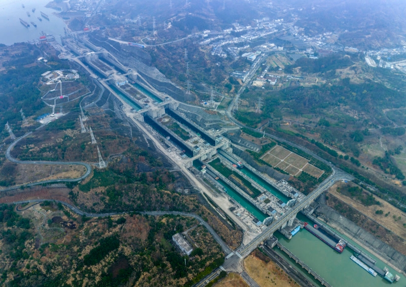 在湖北省宜昌市,船舶有序通過三峽樞紐五級(jí)船閘(2023年1月2日攝,無人機(jī)照片)。新華社發(fā)(王罡 攝)