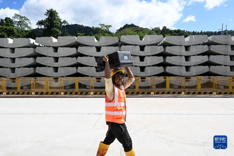 6月28日,在位于馬來西亞彭亨州的馬東鐵項目云頂隧道施工現(xiàn)場附近,一名工人搬運(yùn)箱子。