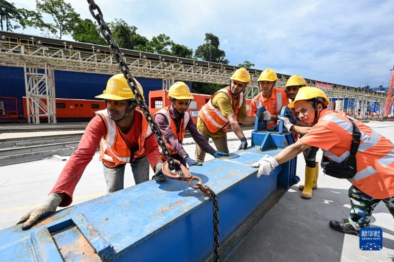 6月28日,在位于馬來西亞彭亨州的馬東鐵項目云頂隧道施工現(xiàn)場附近,幾名工人合力作業(yè)。