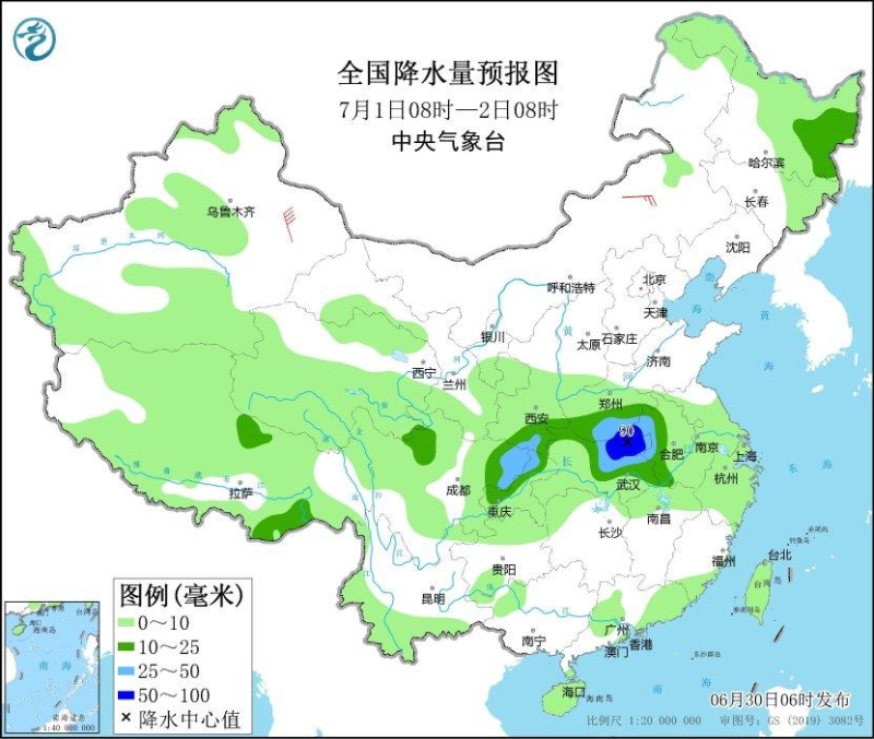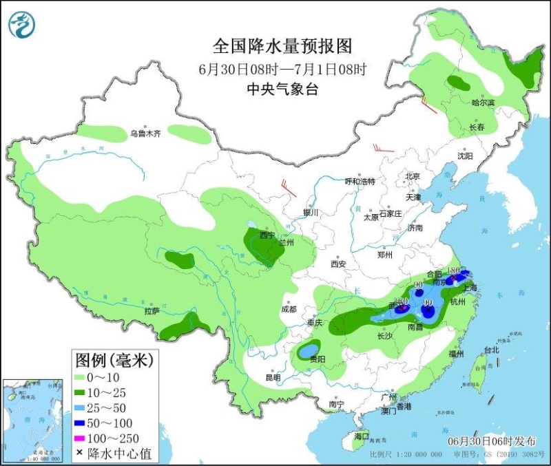 6月30日,湖北東部和南部、安徽中南部、江蘇南部、上海北部、浙江西北部、湖南東北部、江西北部、貴州西北部等地部分地區(qū)有大到暴雨,其中,湖北東南部等地局地有大暴雨(100~180毫米)。上述部分地區(qū)伴有短時強降水(最大小時降雨量20~40毫米,局地可超過60毫米),局地有雷暴大風(fēng)等強對流天氣。