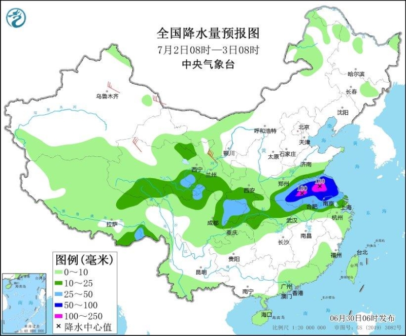 7月2日08時至3日08時,四川盆地、重慶中北部、陜西南部、湖北西部和北部、河南南部、安徽大部、江蘇、上海、青海東部和南部、西藏東南部等地部分地區(qū)有中到大雨,其中,河南東南部、安徽北部、江蘇中北部等地部分地區(qū)有暴雨或大暴雨(100~180毫米)。新疆沿天山地區(qū)和東部、青海西部等地部分地區(qū)有4~6級風(fēng),其中,甘肅河西部分地區(qū)有6~7級風(fēng)(見圖4)。