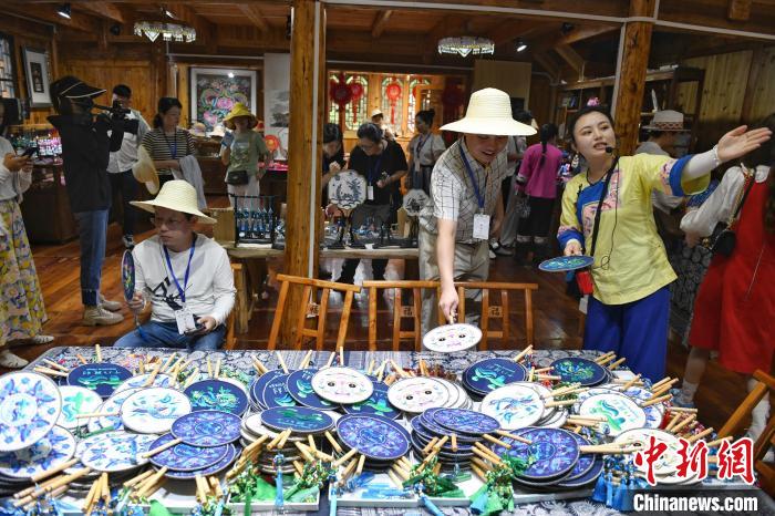 中新網(wǎng)湘西6月29日電 (鄧霞 劉曼)在湖南十八洞村苗繡品展廳里,琳瑯滿目的苗繡服裝、苗繡團(tuán)扇、苗繡首飾等手工藝品,讓馬來(lái)西亞《亞洲時(shí)報(bào)》媒體顧問(wèn)江雪鴻很是驚艷,忍不住入手了一把精巧的苗繡花扇和一副帶苗繡元素的耳環(huán)。