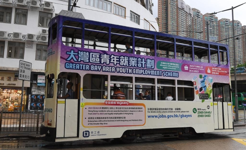 這是6月24日拍攝的涂裝“大灣區(qū)青年就業(yè)計(jì)劃”宣傳海報(bào)的電車。新華社記者 陳鐸 攝
