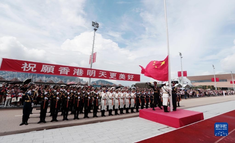 7月1日,解放軍駐港部隊(duì)昂船洲軍營(yíng)舉行升國(guó)旗儀式。新華社發(fā)(易定 攝)