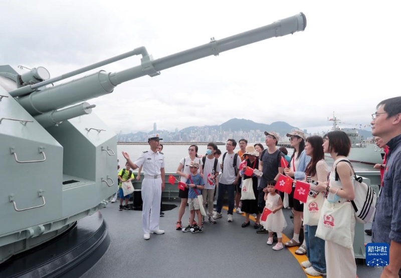 7月1日,在昂船洲軍營(yíng),解放軍官兵為參觀艦艇的香港市民講解武器裝備。新華社發(fā)(易定 攝)