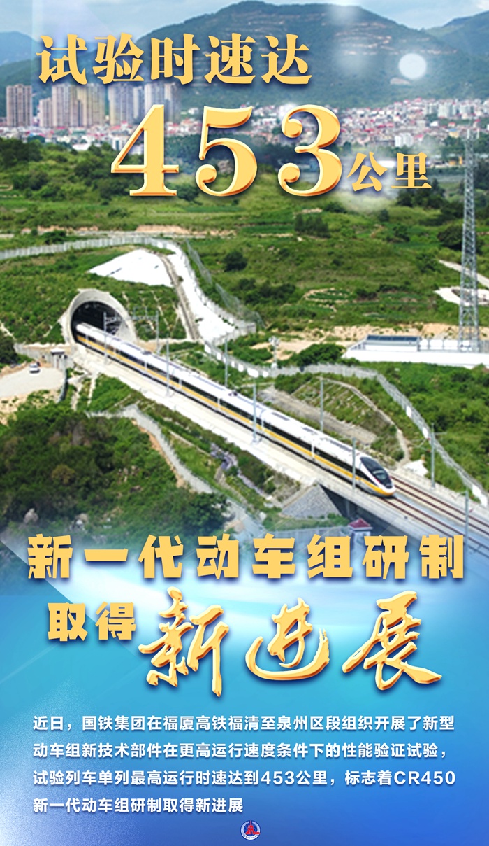新華社北京7月1日電(記者樊曦)記者7月1日從中國國家鐵路集團有限公司獲悉,國鐵集團在福廈高鐵福清至泉州區(qū)段組織開展了新型動車組新技術(shù)部件在更高運行速度條件下的性能驗證試驗,試驗列車單列最高運行時速達到453公里,標志著CR450新一代動車組研制取得新進展。