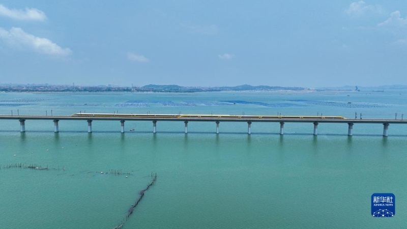6月28日,在湄洲灣跨海大橋,試驗列車以單列時速453公里運行。新華社發(fā)(鐵科院集團公司供圖)