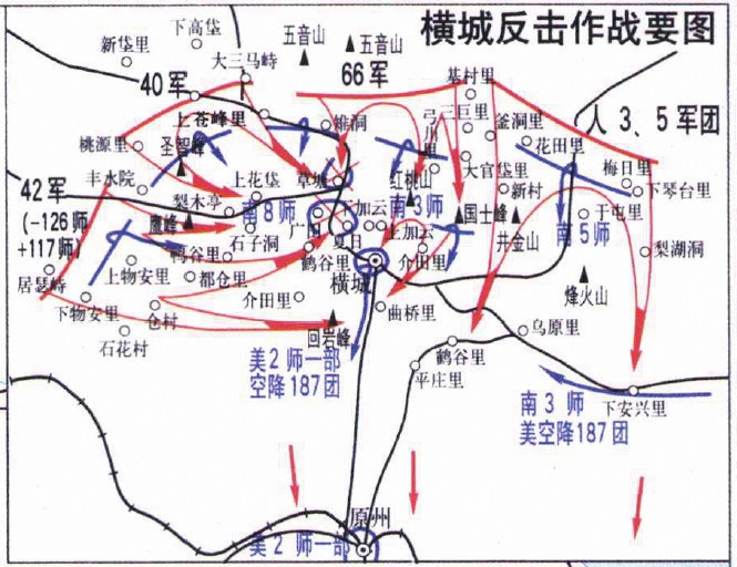 一是形成鉗形攻擊。經(jīng)過(guò)短時(shí)間火力急襲后,志愿軍以鉗形攻勢(shì)迅速發(fā)起進(jìn)攻。第42軍從西南和正西方向發(fā)起攻擊后,第124師迅速占領(lǐng)上物安里等要地,為第117師和第125師打開(kāi)進(jìn)攻通道,至2月12日晨占領(lǐng)廣田,并與第40軍第118師一部會(huì)合,迅速前出至夏日地區(qū)完全截?cái)嗄铣r第8師與橫城的聯(lián)系,2月12日10時(shí),志愿軍前出至回巖峰截殲?zāi)咸又當(dāng)?。?0軍從西北方向發(fā)起攻擊后,左翼第120師迅速攻占圣智峰和梨木亭,左翼第118師迅速進(jìn)占廣田,一部與第42軍第124師會(huì)合,形成對(duì)橫城之?dāng)车暮香Q。第66軍從北部方向發(fā)起進(jìn)攻后,第198、第197、第196師先后攻占草塘、紅桃山、大官岱里等要地。反擊作戰(zhàn)過(guò)程中,志愿軍曾兩次嚴(yán)令第66軍“主力應(yīng)向橫城以南急進(jìn),務(wù)必于明(十二)日拂曉前將橫城南逃敵退路切斷”。至2月12日8時(shí),志愿軍基本殲滅橫城以北南朝鮮第8師3個(gè)團(tuán)。美軍一部在美軍空軍掩護(hù)下企圖突圍,被志愿軍第117師阻于夏日地區(qū)。至當(dāng)日21時(shí),全殲?zāi)铣r軍2個(gè)營(yíng),等等。在志愿軍橫城作戰(zhàn)的同時(shí),人民軍從東北方向發(fā)起進(jìn)攻,殲滅南朝鮮第3師、第5師各一部,有力配合反擊作戰(zhàn)。