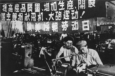 工廠開展抗美援朝勞動日,工人們積極增產(chǎn),支援前線購買飛機、大炮。資料圖片