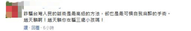 也有臺灣網(wǎng)友評論表示“果然是綠色邏輯思維,沒有最勇敢,只有最無知!”“趙天麟是在說相聲嗎?真愛鬼扯!”“詐騙臺灣人民的話術(shù)是最高級的方法,卻也是最可憐自我麻醉的手術(shù)!趙天麟啊!趙天麟你在騙三歲小孩嗎?”