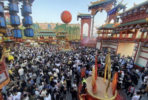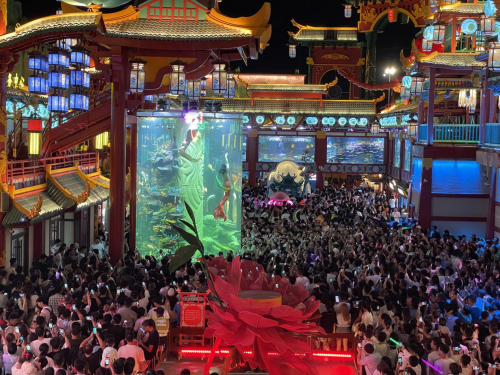 園區(qū)外環(huán)是集“吃、游、購、娛、享”于一體的復(fù)合型商業(yè)步行街,集結(jié)了中外各地特色美食,新疆大草原肚包肉、東北老式鍋包肉、臺灣蚵仔煎、青島老餛燉、韓國炸雞、印度飛餅、泰國香蕉竹、越南卷等百余家商戶,吸引各地游客前來品嘗。同時,“不夜城”引入現(xiàn)代文化,通過聲光電等技術(shù)渲染街區(qū)氛圍,通過燈光秀、音樂秀、互動演繹等表演,引得大量游客駐足觀看。