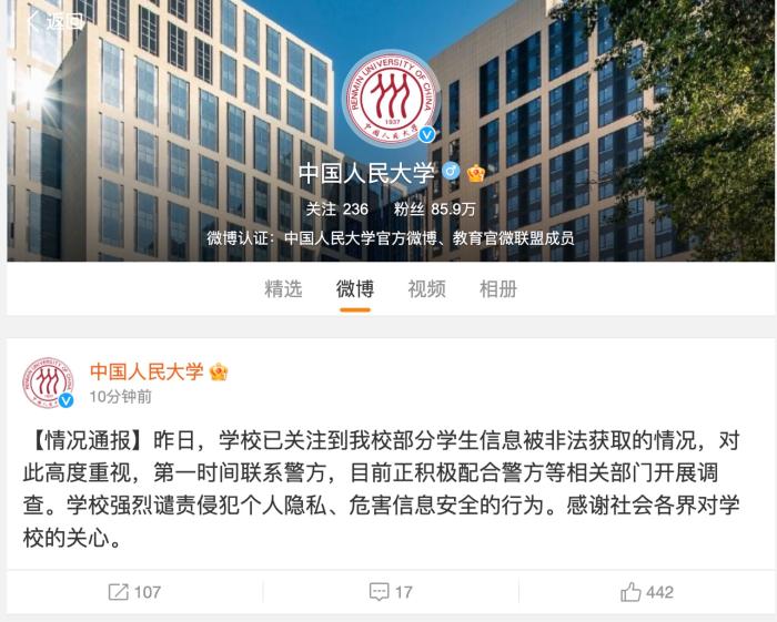 7月2日,@中國人民大學(xué)官方微博發(fā)布情況通報(bào):昨日,學(xué)校已關(guān)注到我校部分學(xué)生信息被非法獲取的情況,對此高度重視,第一時間聯(lián)系警方,目前正積極配合警方等相關(guān)部門開展調(diào)查。學(xué)校強(qiáng)烈譴責(zé)侵犯個人隱私、危害信息安全的行為。感謝社會各界對學(xué)校的關(guān)心。